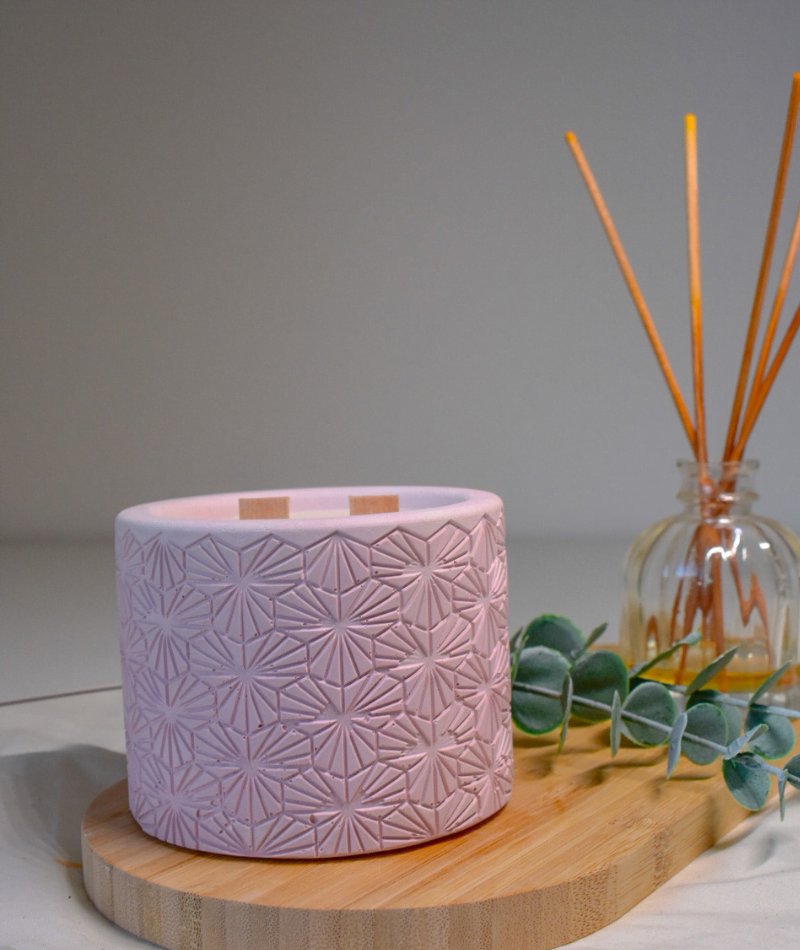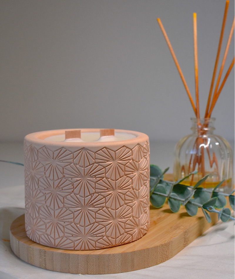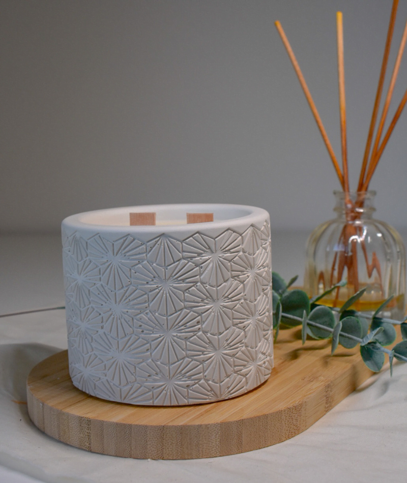 Bougie élégance : Contenant en plâtre fait main, unique et raffiné. 180 g de cire de soja 100% naturelle, pour une combustion propre et sans fumée.